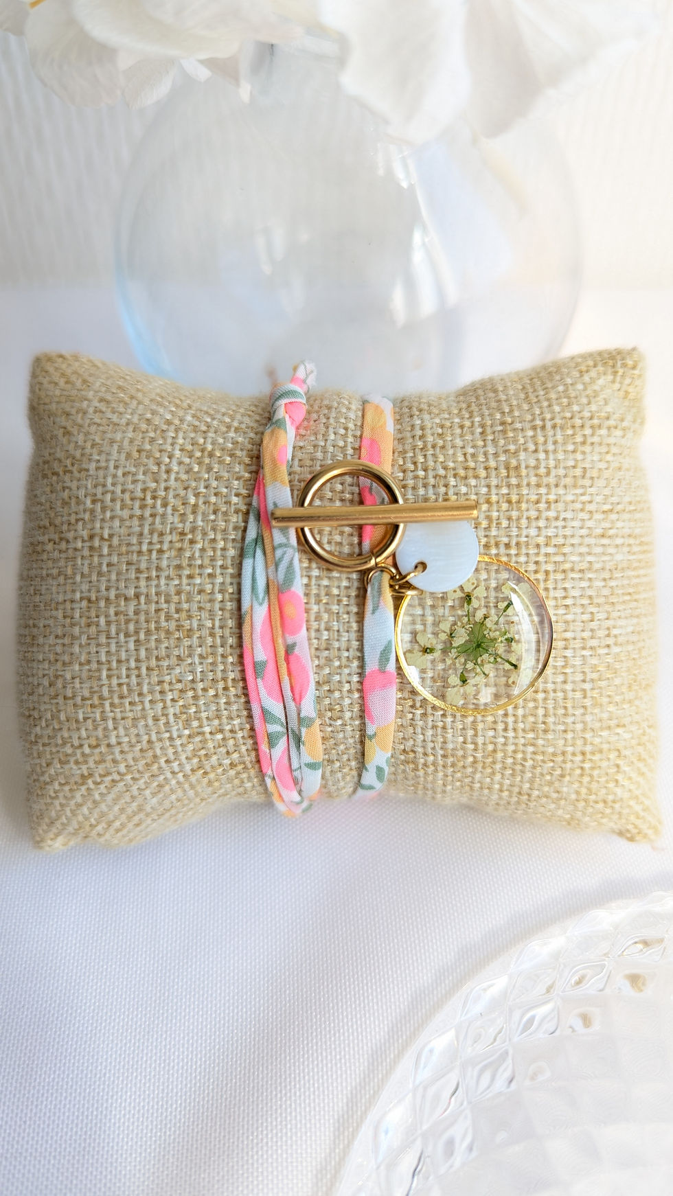 Plongez dans un univers de délicatesse et de poésie avec la collection des bracelets en tissu style liberty, ornés de médaillons en fleurs préssées avec leurs pâquerettes ramassées avec amour dans nos jardins.